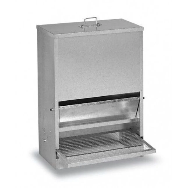Si l’animal n’a pas le poids minimum requis (environ 220 grammes) en montant sur la pédale de la trémie, il ne pourra pas l’ouvrir et n’accèdera pas à la nourriture. Ainsi, les rongeurs et les petits oiseaux ne peuvent pas y accèder. La pédale est grillagée pour une meilleure adhérence des volailles.