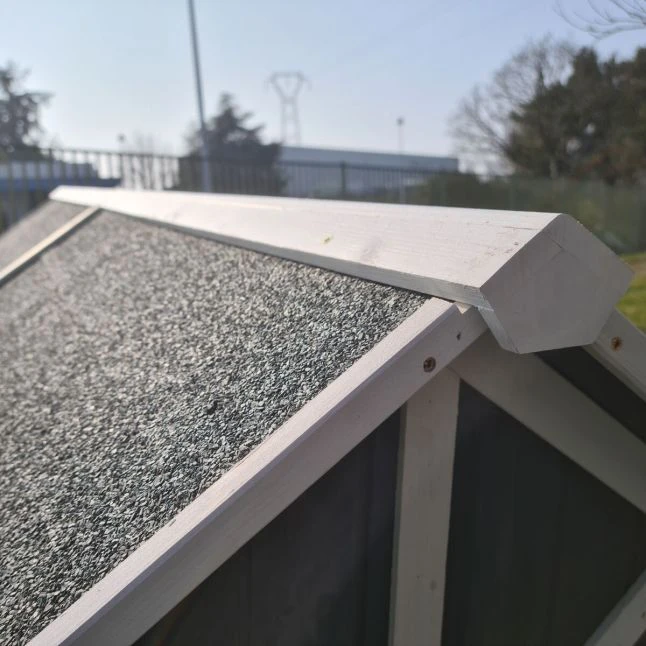 Partie nuit et enclos sont couverts par la toiture en double pente dont le bardeau bitumé et gravillonné également appelé shingle est étanche. C’est le même matériau que l’on retrouve sur beaucoup d’abris de jardin par exemple.